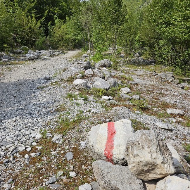 ההליכה מתחילה בירידה אל ערוץ הנהר המרכזי של העמק, לומי אי ט'תית (Lumi i Thethit).